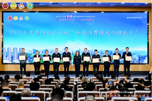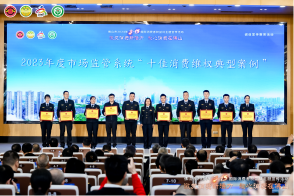 活動現(xiàn)場還為2023年度佛山市及市場監(jiān)管系統(tǒng)的十佳消費維權(quán)典型案例承辦單位、十佳消費維權(quán)辦理能手,“放心消費承諾”“線下無理由退貨承諾”單位,以及市級消費教育基地單位等授牌。